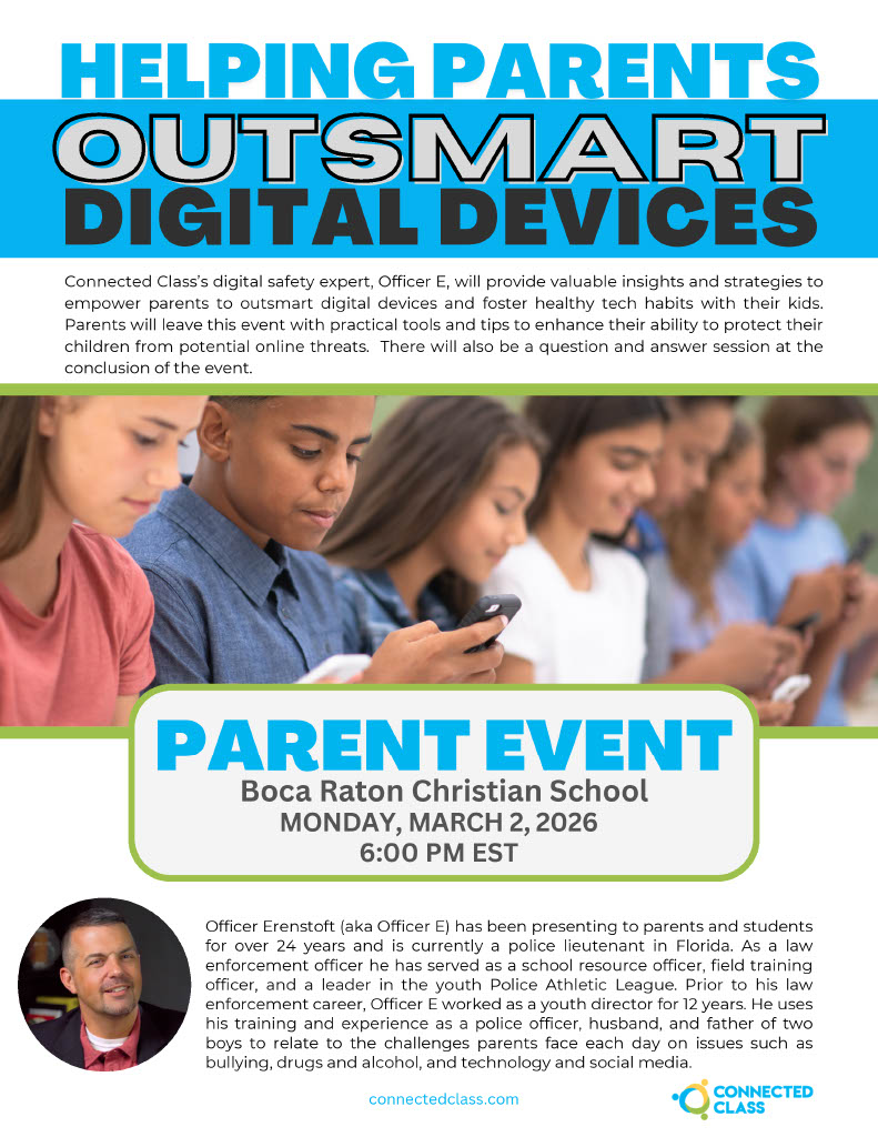 On Monday, March 2nd, from 6:00 p.m. to 7:30 p.m., in the Chapel, Officer E. will speak about Helping Parents Outsmart Devices. This seminar is for parents only.