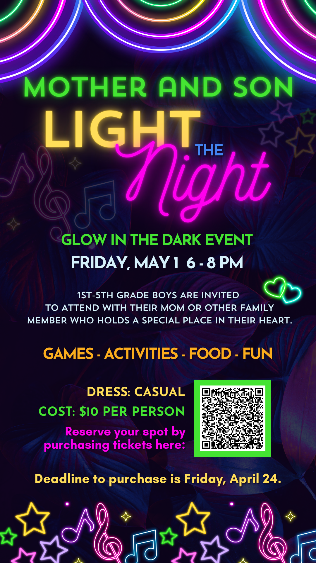 This will be a fun glow-in-the-dark night, a time for moms and sons to enjoy food, games, photo ops, and other activities!
